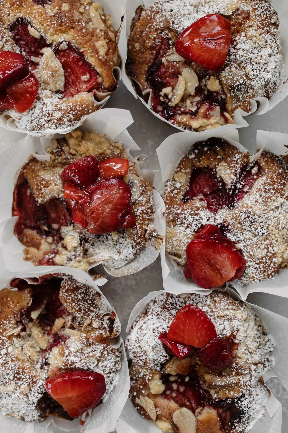 For the balsamic strawberry variation, fold through the roasted strawberries and white chocolate. Fill the muffin liners 2/3rd’s of the way full with batter, then cover with an even amount of streusel.