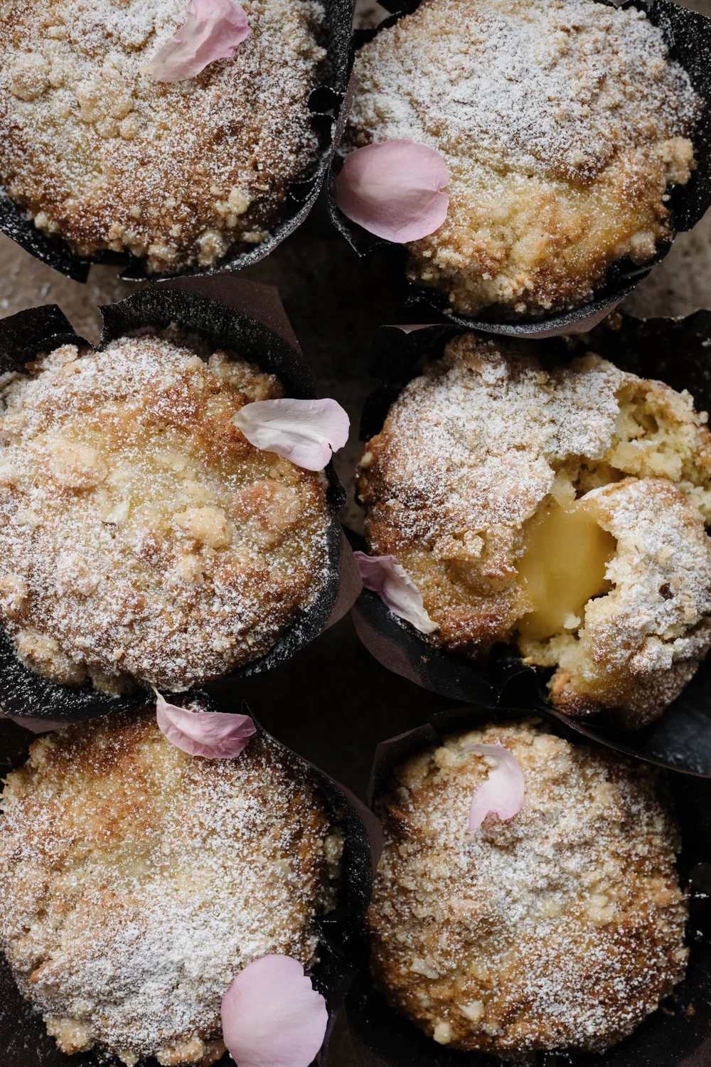For the lemon curd variation, fold through the caramelised white chocolate chunks. Fill the muffin liners 2/3rd’s of the way full with batter, then evenly dint in the lemon curd and cover with streusel.