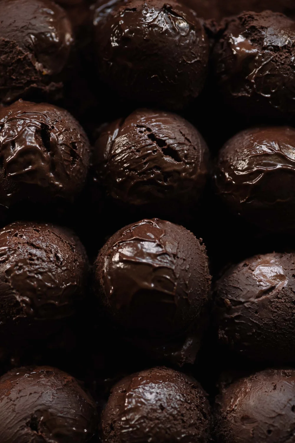 To finish, put enough cocoa powder in a shallow bowl. With a lightly-warmed scoop or spoon, portion out even-sized truffles, dusting each as you go with a rattle of the hand. If at some point the ganache becomes too soft to handle, as it often will if the weather is hot, manoeuvre the bowl between the work bench and the refrigerator. It’ll help. Serve, soon after, or keep cold.